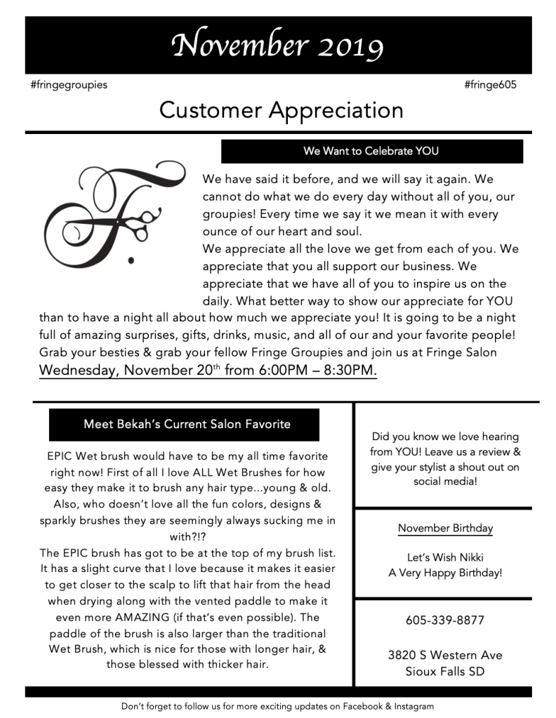 November News Letter Posted byfringesalonsfOctober 31, 2019Posted inUncategorized The November news letter is all about YOU! Share this: Click to share on X (Opens in new window) X Click to share on Facebook (Opens in new window) Facebook Like Loading... Related
